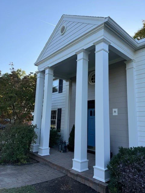 PROJECT SUMMARY: This project started because the original wood siding was rotting and not holding paint any longer. There was some concern about some rot under the siding and that proved to be the case on the right corner. The front porch posts were also hollow which was a surprise. The customer was concerned about keeping the original details of the house which included the trim and the front entry shiplap siding, which was not problem. The customer was very happy with the outcome and the peace of mind that there is no maintenance for them to complete. We used James Hardie shiplap siding in the front porch area and pvc moldings to complete the detailed look.